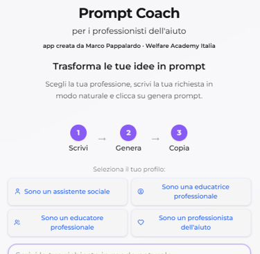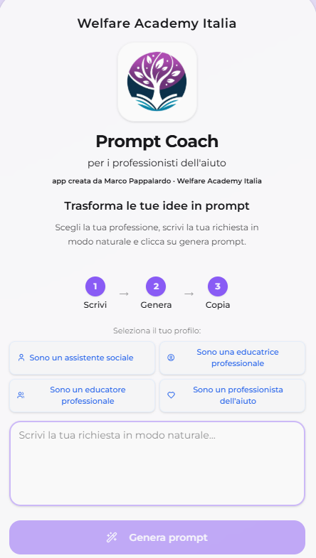 Una web app che ti consente di generare un prompt per l'IA senza dover conoscere tutte le regole dell'IA. Scrivi la tua richiesta il più completa possibile e la web app ti genera un prompt da copiare e incollare